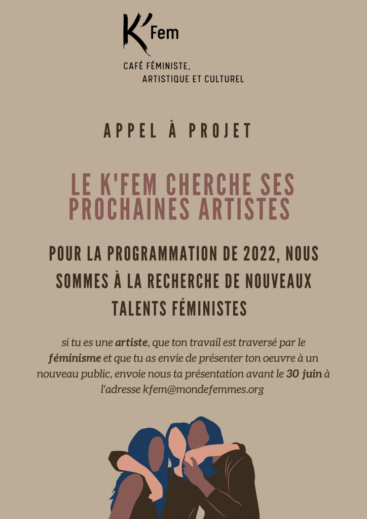 Si vous pensez correspondre à cette description et que vous avez envie de rejoindre la programmation du K’Fem pour l’année 2022, n’attendez plus ! Envoyez-nous votre dossier de présentation à l’adresse kfem@mondefemmes.org