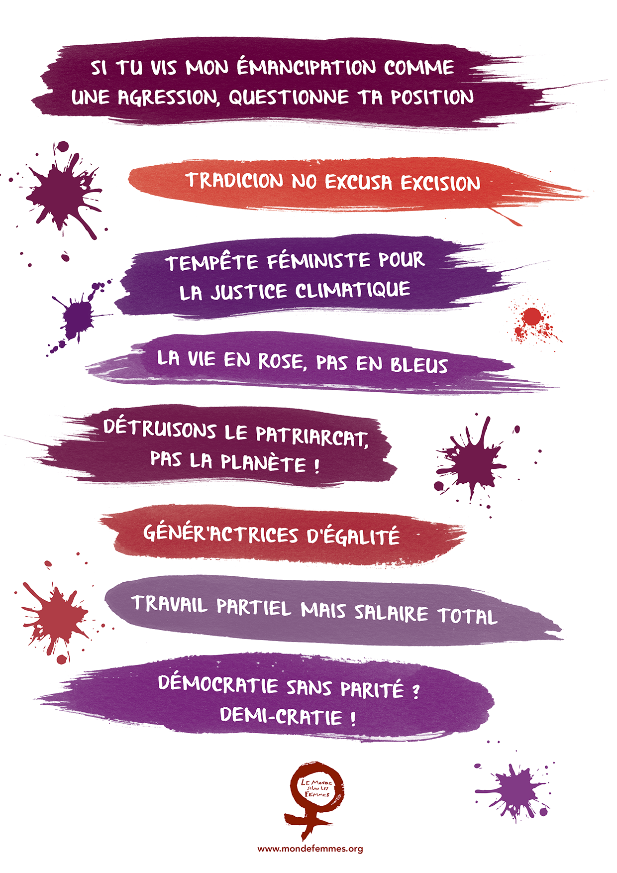 - au recto, huit slogans colorés et percutants sur l’égalité entre les femmes et les hommes